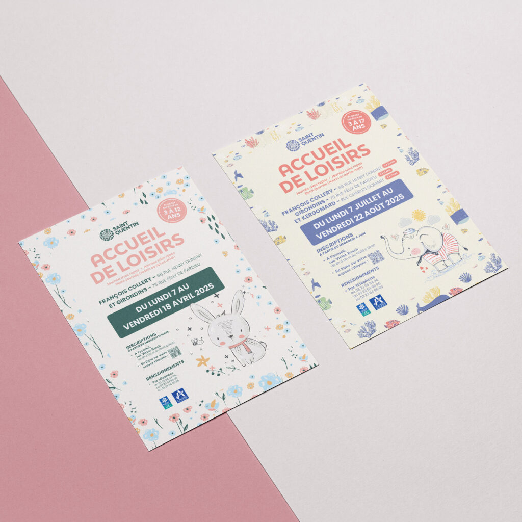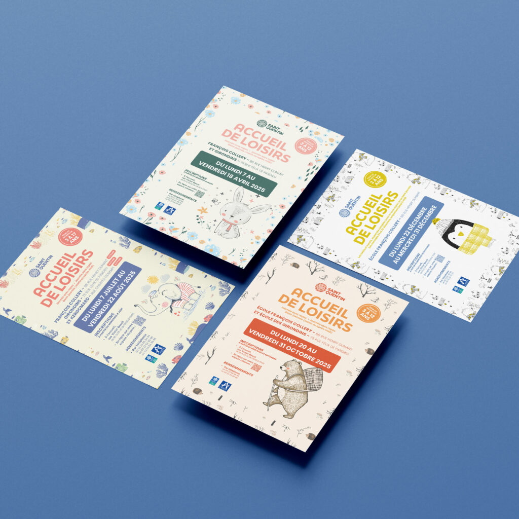 Création d’affiches et de flyers pour promouvoir les accueils de loisirs pendant les périodes de vacances scolaires, de la ville de Saint-Quentin. L’identité visuelle est douce et colorée, avec des choix illustratifs qui rappellent l’univers de l’enfance.