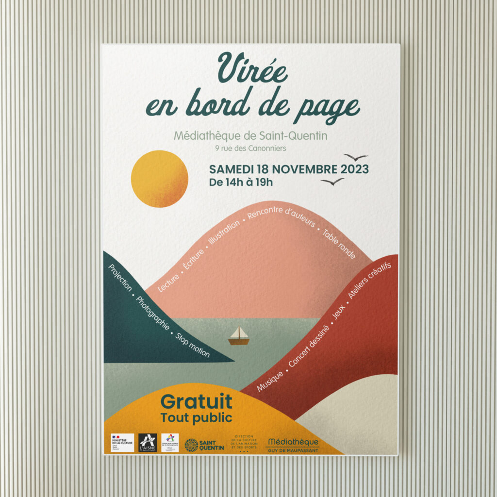 Réalisation d’une illustration pour l’évènement « Virée en bord de page » de la médiathèque de la ville de Saint-Quentin. Cet évènement est tout public et les activités proposées sont variées : ateliers, conférences, jeux…