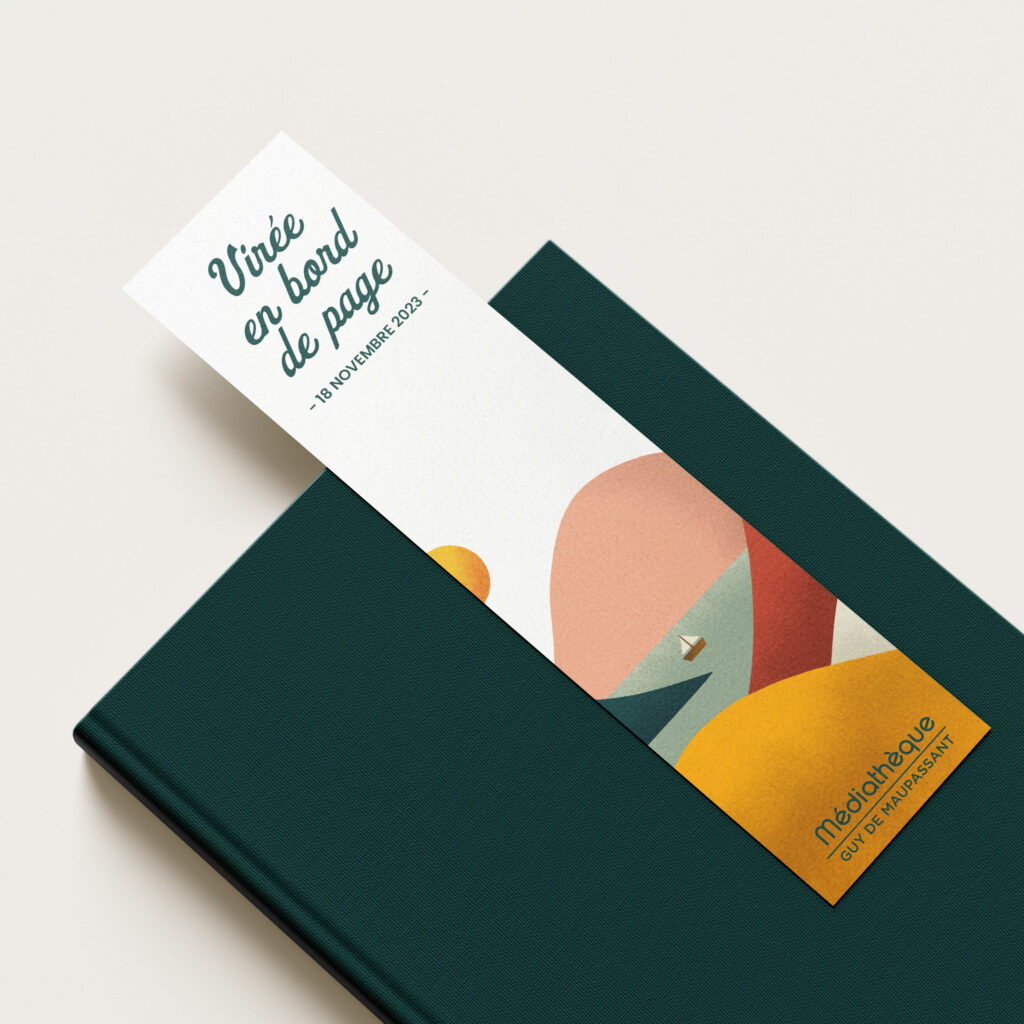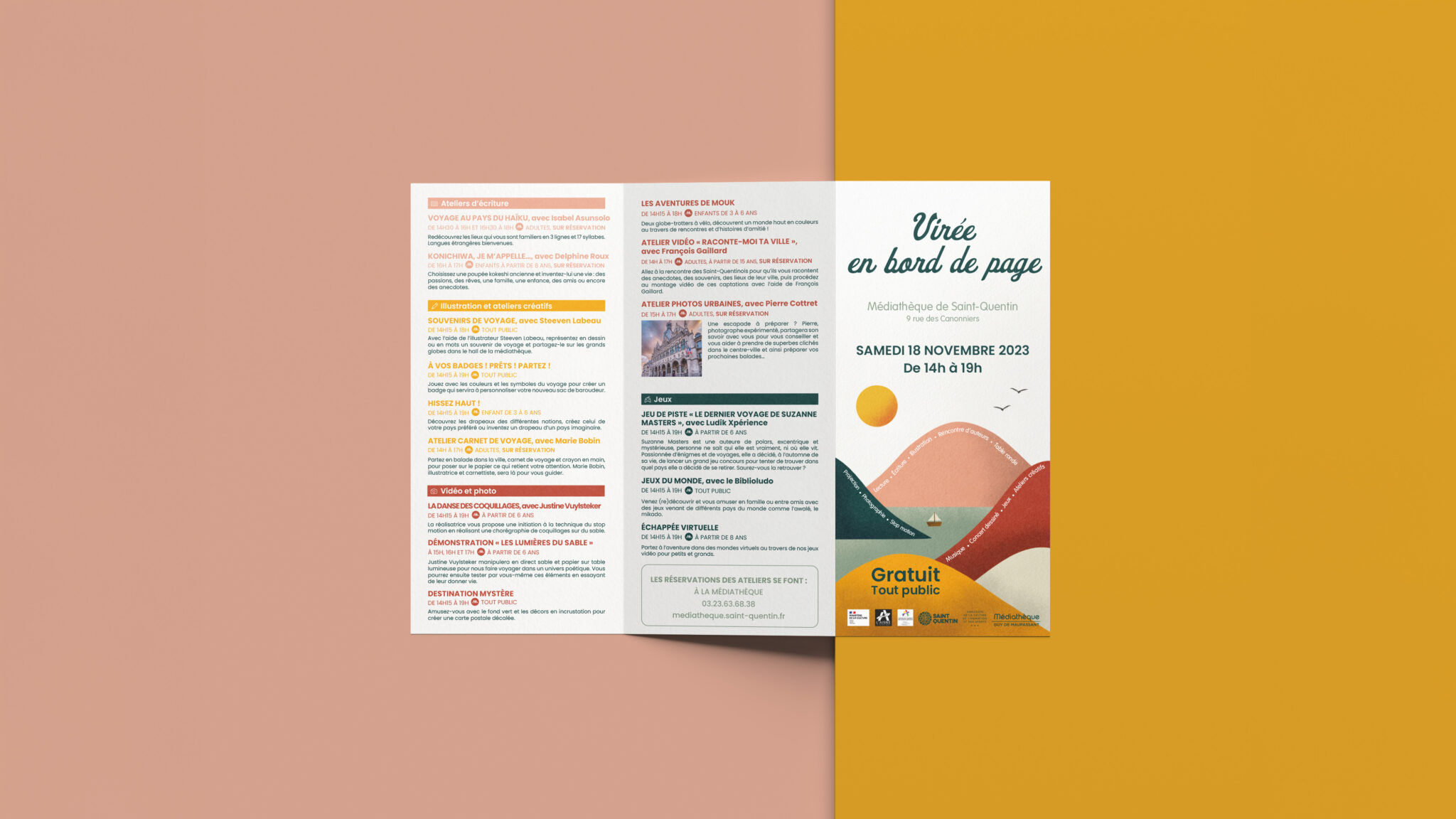 Une fois le visuel réalisé, il est décliné sur plusieurs supports à la demande de la médiathèque : affiche, marque-page, programme dépliant, livret pour enfants et bien d’autres !
